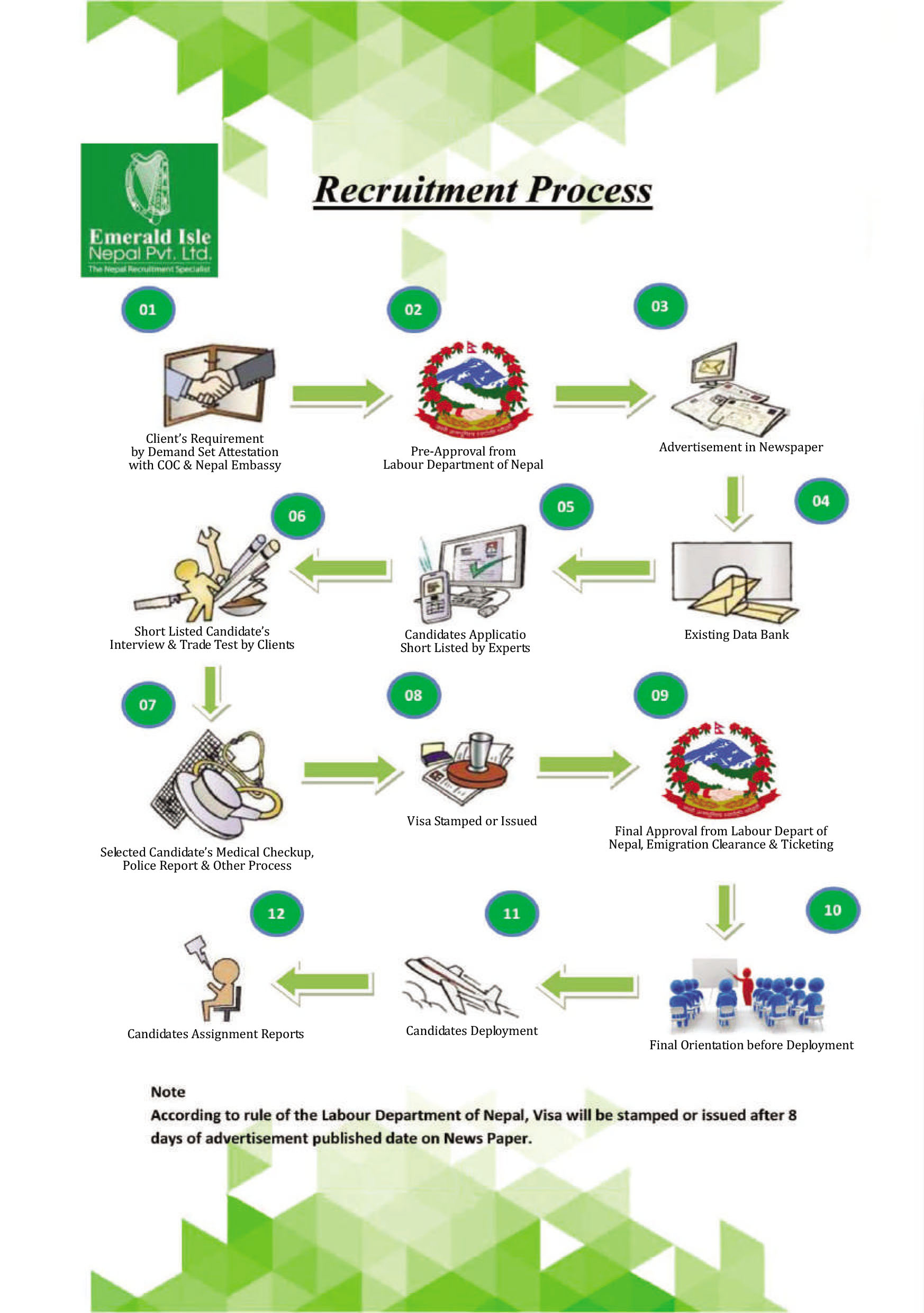 We maintain an up to date data bank of potential candidates with full information on their skills, education, technical/trade qualification and experience and advertising allows other candidates to compete for the post. Emerald Isle Nepal Pvt. ltd. screens the short-listed candidates by pre-interview. The final interview for sort listed candidates after pre screening can be conducted by the employer or his representative or by Emerald Isle Nepal Pvt. Ltd. taking oral, written and practical test. The selection is made purely on merit basis giving equal opportunities to all. The employers are confident that the personnel selected by the selection committee will fulfill their human resource needs.